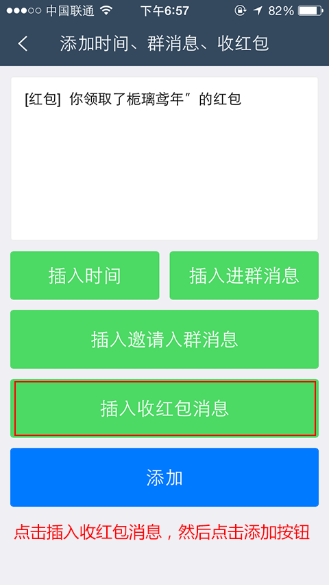 然后点击“插入收红包消息”,再点击添加按钮