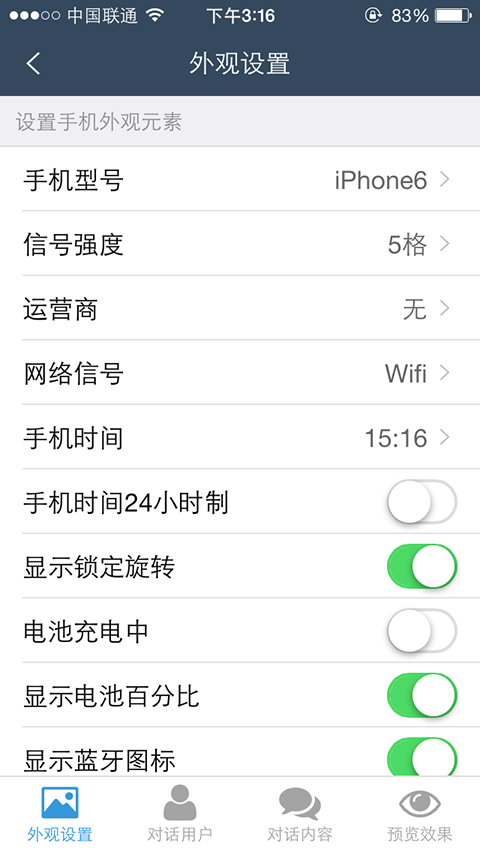 在微信对话生成器、微信转账生成器、微信钱包生成器、支付宝转账生成器、支付宝余额生成器里面,都有外观设置,您可以在这里设置手机型号、运营商、手机时间、手机状态栏图标等等