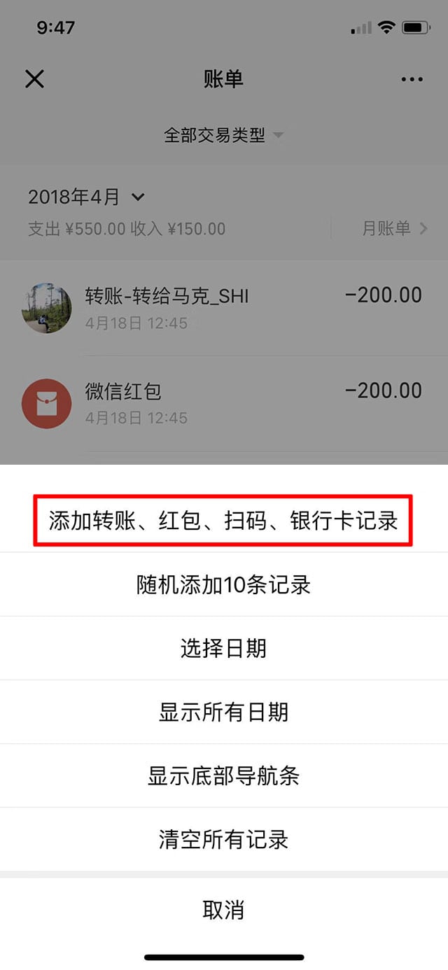 2.点击选择添加转账、红包、扫码、银行卡记录(或可以选择随机添加记录)